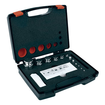 Pesiera con custodia in plastica di alta qualità, completa di pesi in acciaio INOX in classe M1 secondo la raccomandazione OIML R111 e adatti per applicazioni di metrologia legale e nel settore industriale. La classe di precisione M1 consente l'utilizzo di questi pesi per il controllo e la taratura di bilance e strumenti di misura in classe III, fino a 10.000e.